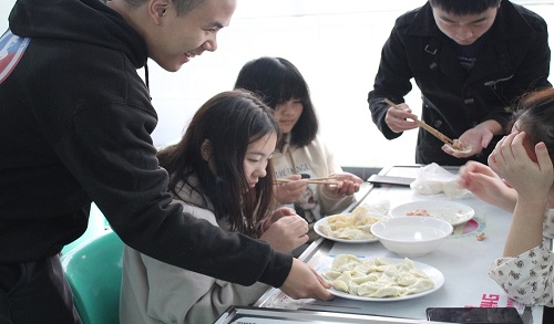 下午14:00,活动准时开始。同学们首先在新月楼食堂固定位置准备就绪,跃跃欲试。随后,同学们围坐在一起,以寝室为单位,都开始亲手实践,每组同学别出心裁地包着饺子并设计成各种形状,饱含着各种意义。在包饺子的同时,大家围绕学习、生活、工作等话题不时交谈着,老师与同学们亲切的互动,用爱包起了一个个饺子,师生情感也随之加深。随后同学们包的饺子被送进了厨房,开始煮水饺、蒸水饺,在这期间,同学们也没有闲着,一个个别开生面的节目让等待不再煎熬。终于,在大家的不懈努力下,一碗碗热气腾腾的饺子在大家的期待中被端上了餐桌,吃着自己包的香喷喷的饺子,同学们不仅感受到了青春的快乐,还感受到了集体的温暖,脸上都洋溢着幸福快乐的微笑。