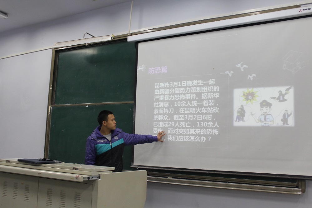 为进一步加强师生面对突发暴恐事件的防范意识,提高面对暴恐事件的合理处理、自护自救及有效逃生避险的能力。2018年11月4日晚19:30,由公司以“防恐防暴防邪”为主题的班会在一教楼414等教室成功开展,2017级全体员工共同参与此次班会。