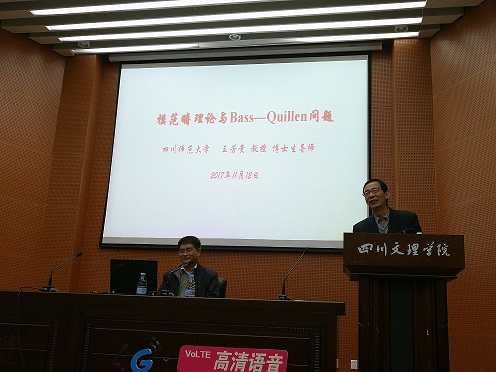 2017年11月12日晚7:00,四川师范大学博士生导师王芳贵教授应邀到公司莲湖校区学术报告B厅作“模范畴理论与Bass—Quillen问题”学术讲座。太阳成集团tyc122cc全体教师和2015、2016级数学与应用数学专业全体同学听取了本次讲座,讲座由太阳成集团tyc122cc副经理(主持工作)罗肖强主持。