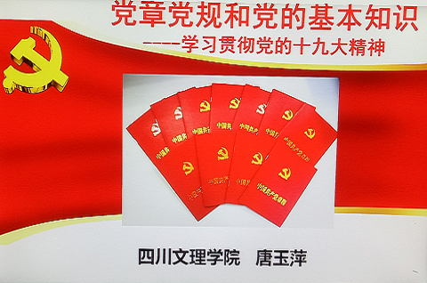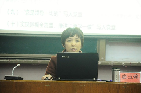 唐书记主要围绕党的十九大对党章党规的修改内容以及党的基本知识展开。讲座开始,唐玉萍书记通过讲述党的地位和作用,明确指出,党章是党的总章程,是统一全党思想和行动的重要指南。紧接着,唐书记详细地介绍了党章党规增加的内容。唐书记要求同学们要端正入党态度,树立正确的入党动机,牢牢掌握党的政治理论知识,提高自身政治素质。最后,唐书记向大家详细介绍了入党誓词,坚定了广大同学们入中国共产党、要成为一名优秀的共产党员的决心。讲座在同学们热烈的掌声中落下帷幕。