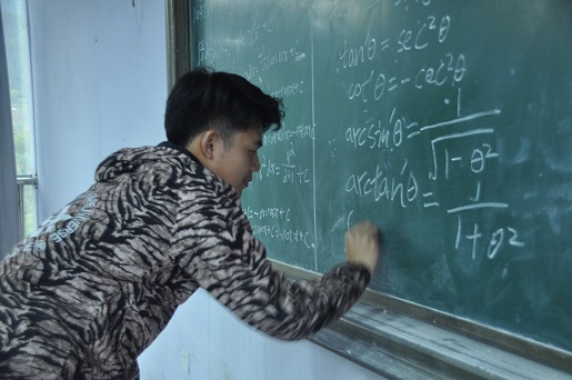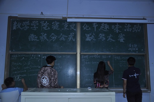 此次比赛以寝室为单位,这既考验同学们的数学专业知识能力,也考验寝室的团结合作精神。同学们在大赛主持人杨菊的安排下井然有序的出场,以寝室为单位出一人参赛,计时五分钟,看谁在规定的时间内写出的公式越多获胜。