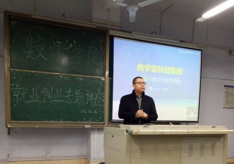 2016年12月26日晚7点,在莲湖校区一教412教室,北京尚学堂科技有限公司副总裁马会龙先生为公司员工带来了一场精彩的就业创业讲座,讲座由公司罗肖强副经理主持。