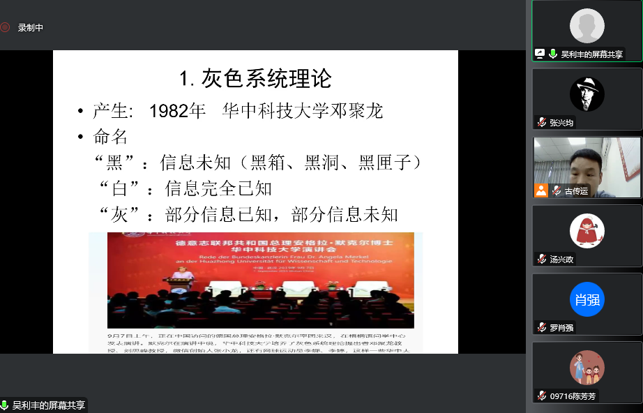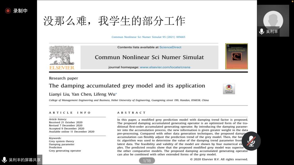 吴利丰教授分别从灰色系统理论的起源、分数阶灰色预测模型提出的过程、分数阶灰色预测模型的研究进展和分数阶灰色预测的未来研究方向等方面,介绍了分数阶灰色理论的研究成果、分数阶灰色预测在理论上的扩展和在环境、能源预测中的应用,从最优阶的确定、分数阶序列累加的推广、复数阶序列累加等问题提出未来的研究方向。吴教授还结合自己的科研经历,同参会的老师和同学们分享了在发现问题、解决问题、文献阅读、学术创新、论文写作、国外投稿等方面的经验与感受。