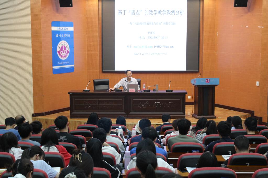 赵老师以基于“四点”的数学教学课例分析为题展开学术讲座,首先,他提出教师的教学过程应从员工学习的起点、疑点、重点、难点着手进行备课以及开展课堂教学。其次,赵老师基于这四点以中学数学教学中的具体案例进行分享与交流,他就“有理数的乘法”的教学、“三角形内角和定理”的教学、“反比例函数图象与性质”的教学进行了详细的分析与讲解。最后,他谈到教师职业生涯与知识结构的发展,对同学们提出期望,希望同学们在今后的教学中能够做到“一篇课文,三次备课”,从而在课堂教学实践中,渐渐成长为教学能手。