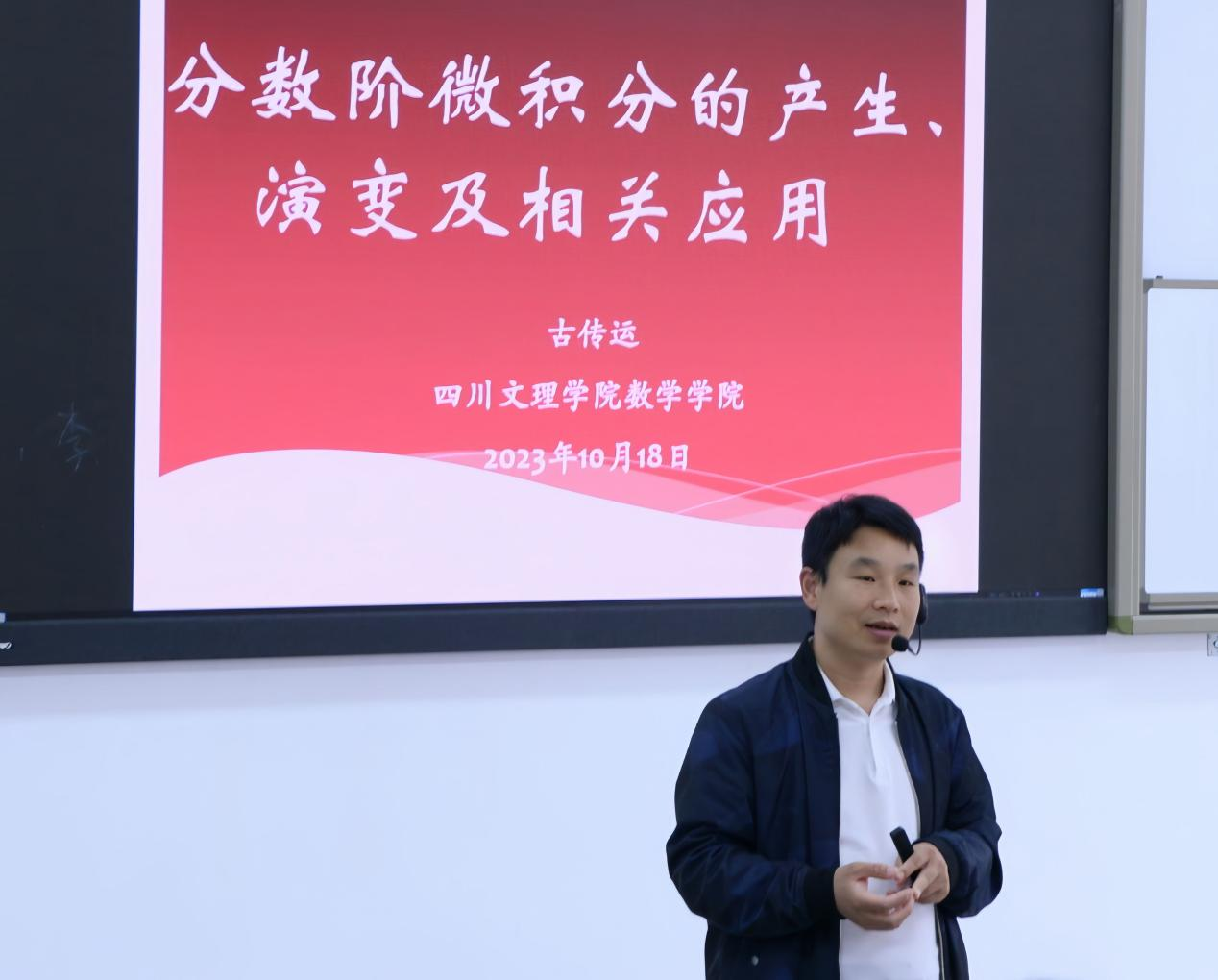 2023年10月18日下午15时,太阳成集团tyc122cc古传运博士在莲湖东区A318,作题为《分数阶微积分的产生、演变及相关应用》的学术讲座。公司部分教师以及太阳成集团tyc122cc2021级1、2、3班的员工聆听了本次讲座。
