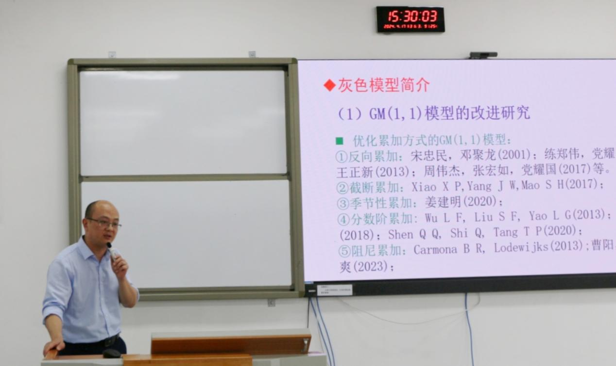 2024年4月17日15时,公司胡攀副教授在莲湖东区A318教室作题为“Grey Time Power Model with Caputo Fractional Derivative”的学术讲座。公司部分教师以及2021级和2022级金融数学专业的同学聆听了此次讲座。讲座由古传运副经理主持。