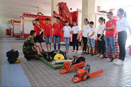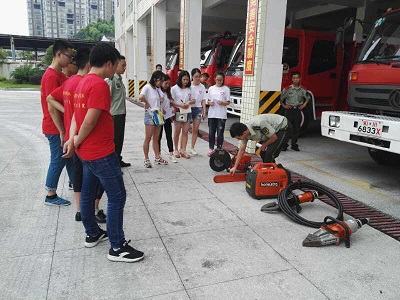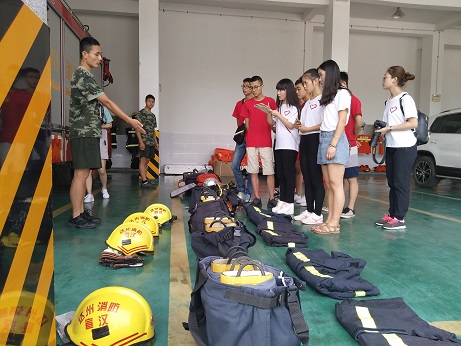 上午,在整队报告后,首先由消防中队田士官带领我们参观了消防队,并且仔细的为我们介绍了消防车辆的装备情况。如水泵,多功能捞钩,手动破拆工具组的详细使用方法及使用范围等。接下来消防志愿者零距离的接触体验了各类消防服,空气呼吸器,切割机,并且穿上了防化服和灭火战斗服,背上空气呼吸器体验如何灭火。在消防官兵的带领下,我们参观了在张家坝消防队二楼的消防官兵的寝室内务和自习室的整理状况,让我们对消防官兵做事的一丝不苟和极强的时间观念有了新的认识。来到消防队四楼参观消防队史馆,志愿者们对史馆内陈设的各种获得的荣誉奖状充满了好奇,频频追问,我们的队长也耐心的为我们答疑解惑。午餐前,由消防中队的孔士官带领我们学唱军歌,我们在宏亮的歌声中感受到了消防官兵在消防工作中的极大的激情。