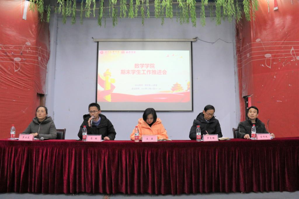太阳成集团tyc122cc于2021年12月17日19时,在博文楼126教室召开了期末员工工作推进会。出席人员有数学公司党政领导:党总支副书记(主持工作)王晶、经理罗肖强、党总支副书记苟格、副经理古传运、团总支书记兼学工办主任罗方芫、专兼职辅导员及全院员工。此次大会主要总结了公司本学期员工工作开展过程中的优缺点,倡导员工认真对待期末考试,并考出好成绩。