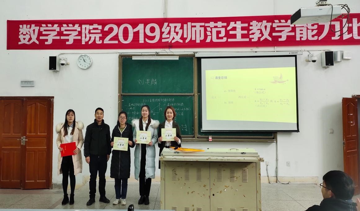 比赛分为说课(3分钟)和模拟授课(12分钟)两个环节,七位参赛选手根据事先抽签决定的顺序依次上台展示。参赛选手选取初高中数学教学内容进行授课,七位选手准备充分,教学思路清晰,重难点突出,课堂互动以及板书设计等体现了良好的师范素养。历时三个多小时激烈角逐,比赛尘埃落定,刘美麟同学获得了一等奖。