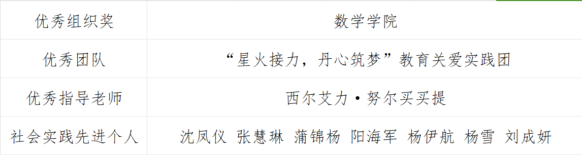 公司被评为优秀组织奖;“星火接力,丹心筑梦”教育关爱实践团评选为优秀团队;西尔艾力·努尔买买提评为优秀指导教师;沈凤仪、张慧琳、蒲锦杨、阳海军、杨伊航、杨雪、刘成妍7名同学评为社会实践先进个人。