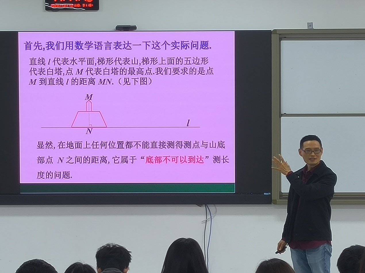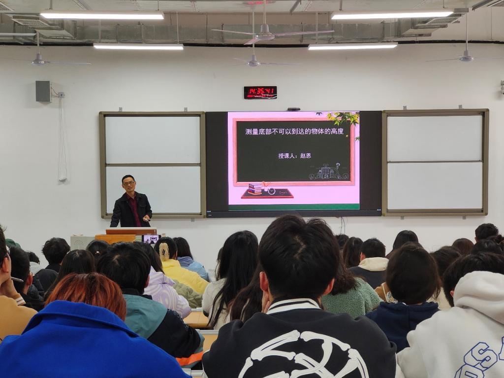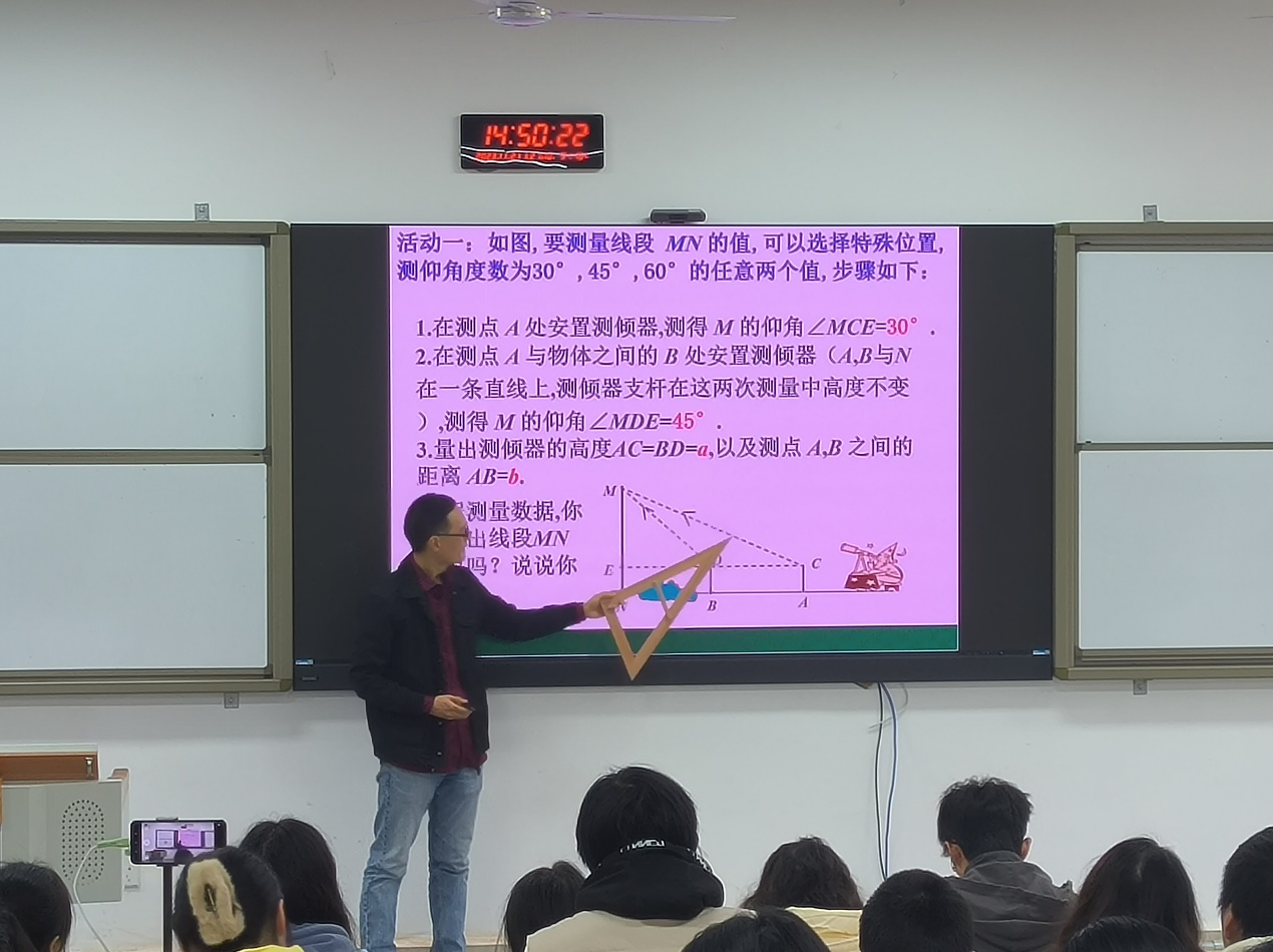 赵恩老师首先为2022级数学与应用数学专业员工带来了一节《测量底部不可以到达的物体的高度》的示范课,他从创设测量塔高的实际情境入手,提出问题;接着给老员工示范如何通过核心问题,引导中员工分析问题解决思路、设计探究任务、开展小组学习。