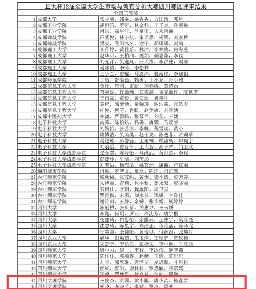 近日,从四川省现场统计学会获悉,公司学子在“正大杯”第十二届全国老员工市场调查与分析大赛中再获佳绩,荣获国家三等奖2项,四川省三等奖3项。