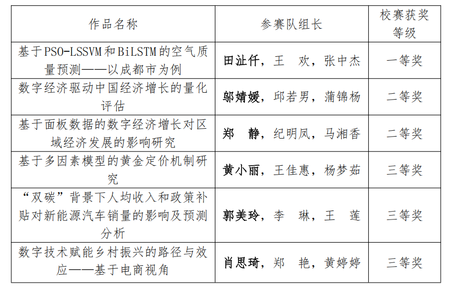 自本届校赛启动以来,各参赛队伍紧扣“统计创新应用,数据引领未来”的大赛主题,聚焦统计方法在实际场景中的创新运用,以数据驱动为核心思路,积极开展调研、建模与分析工作,完成参赛论文。经校赛专家评委评选,最终遴选出6项获奖作品,其中一等奖1项,二等奖2项,三等奖3项。具体获奖名单如下:
